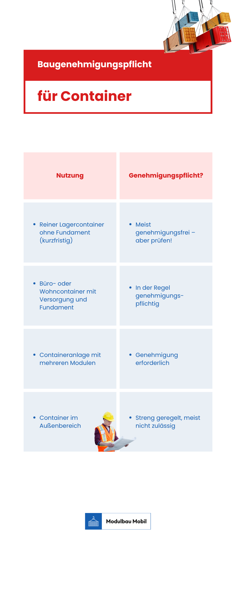 Wer unsicher ist, sollte sich frühzeitig mit der zuständigen Bauaufsichtsbehörde in Verbindung setzen. So lassen sich unnötige Verzögerungen, Bußgelder oder sogar Rückbauverfügungen vermeiden. Modulbau Mobil unterstützt Bauherren auf Wunsch auch bei der Zusammenstellung der Unterlagen für den Bauantrag.